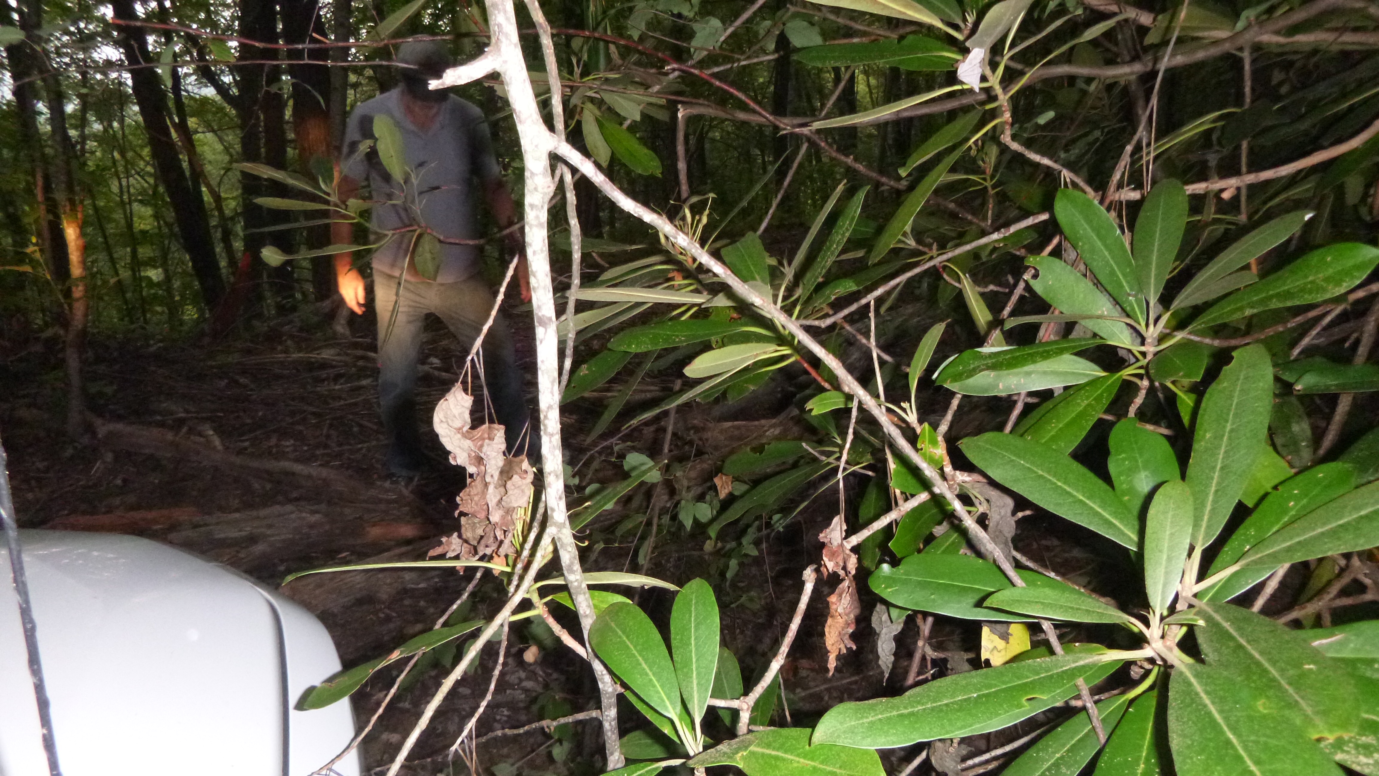 The first 3 miles were narrow paved road which we are used to. When we got to the first turn, I had to look real close because it looked like someone’s driveway. But, there was a road sign so we turned and weaved our way through a pack of dogs. Soon we were on a forest service road going up, up, and up. After about 11 miles we reached the second turn. There was a small path into the woods barely big enough for the truck. It got smaller and quite rough. Within a few minutes, I had to get the saw out so we could get around a blowdown.